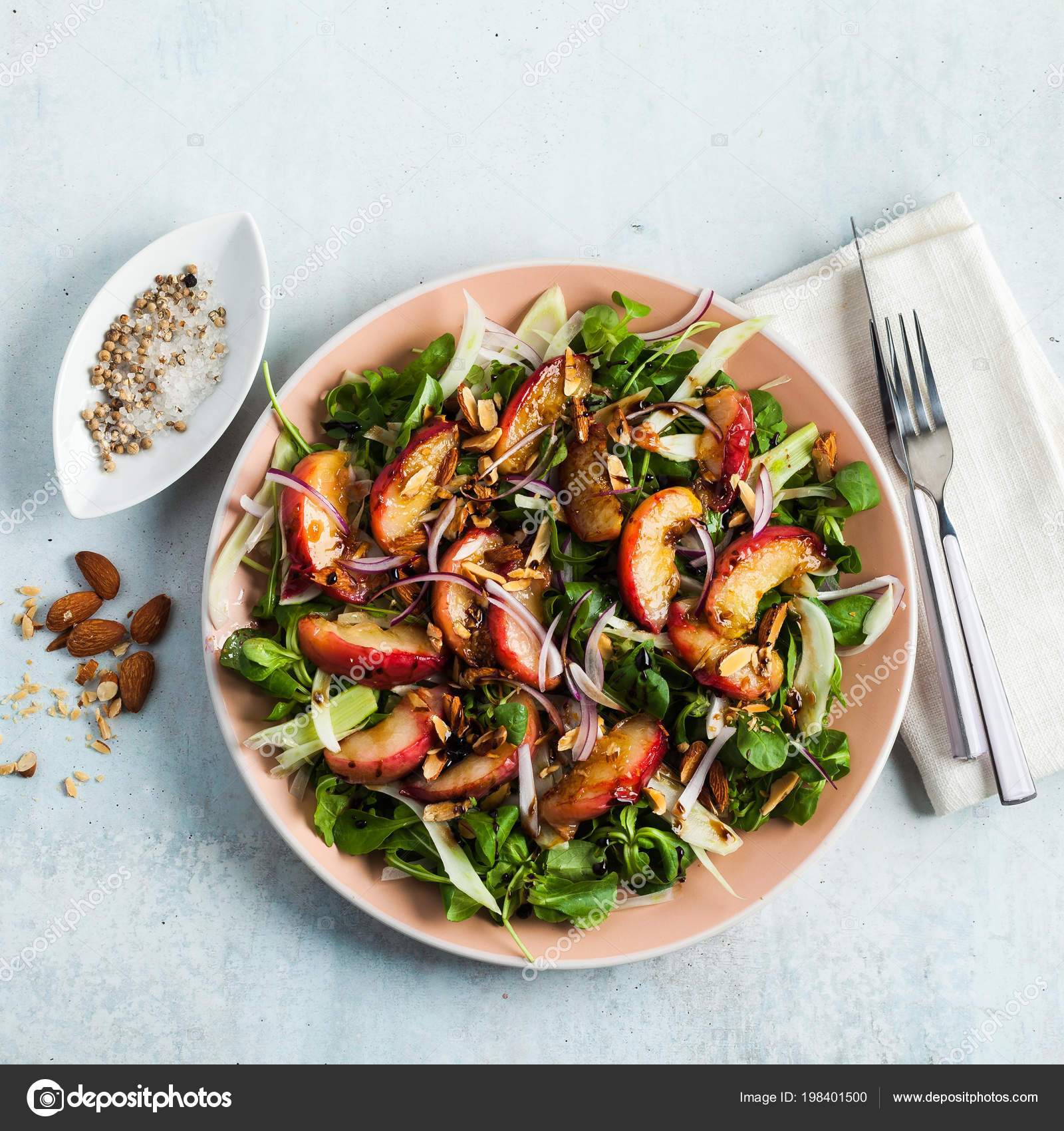 Foto De Salada De Verão Muito Saborosa Com Pêssegos Cebolas Doces E Rúcula Com Amêndoas Em Uma Tabela Em Um Prato Simples Receita Saudável E Mais - Source