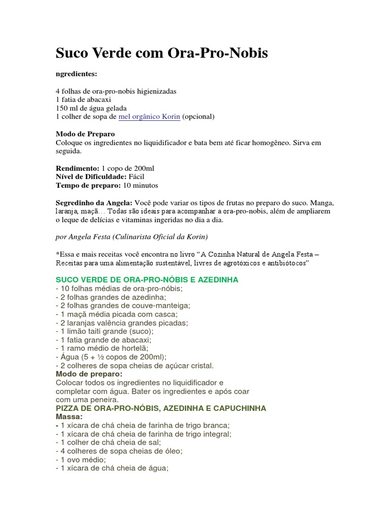Essa é uma receita bem versátil pois cai muito bem como entrada petisco e até acompanhamento. Rodrigo almeida teixeira. Suco de ora pro nobis 20 folhas de ora pro nobis 1 manga grande 1 fatia de abacaxi e 500 ml de água.